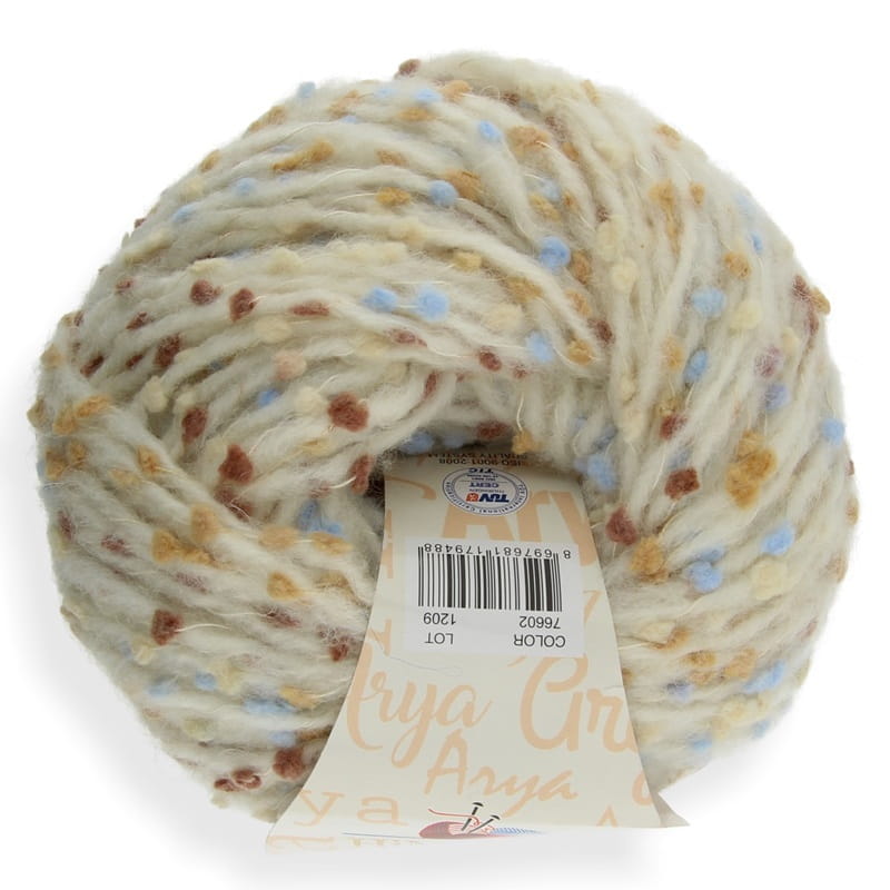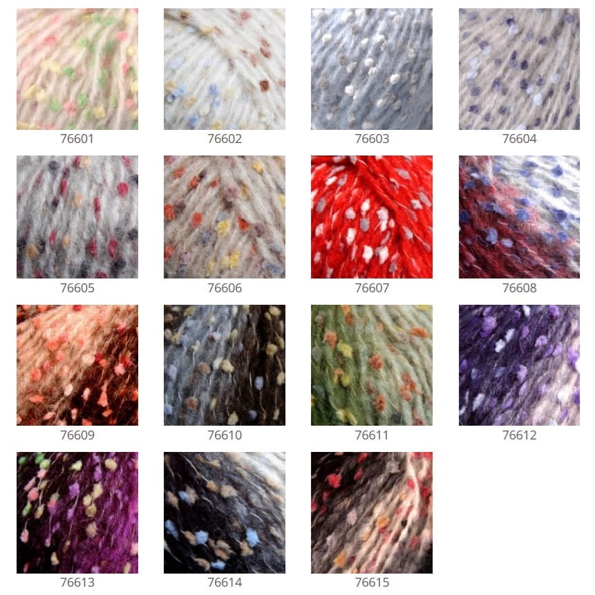 Fantazyjna miękka włóczka z gęsto rozmieszczonymi (co ok 1,5cm) kolorowymi nopkami.